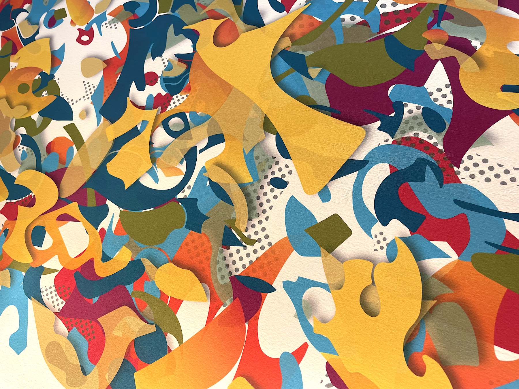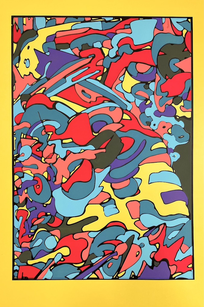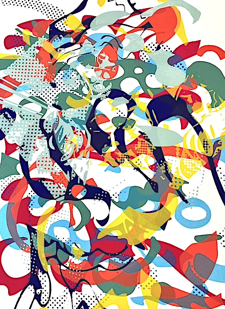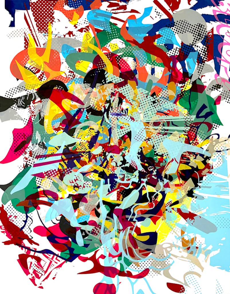 Hand pulled screen print / mono-print. 20″ x 24″. Framed and signed.