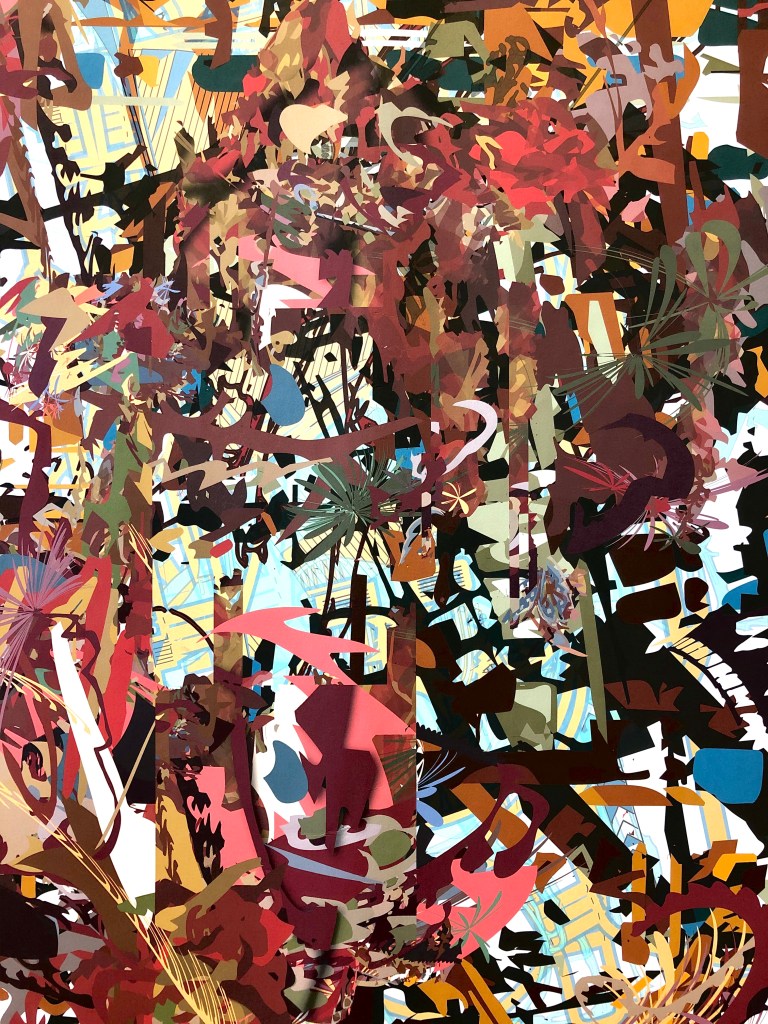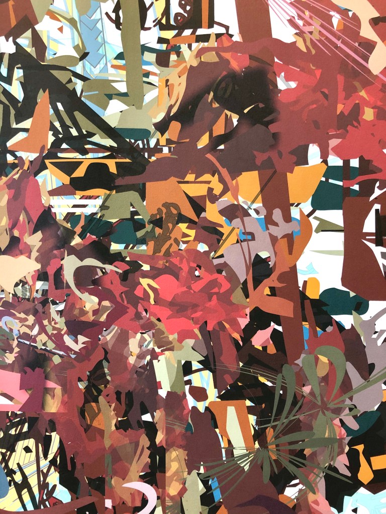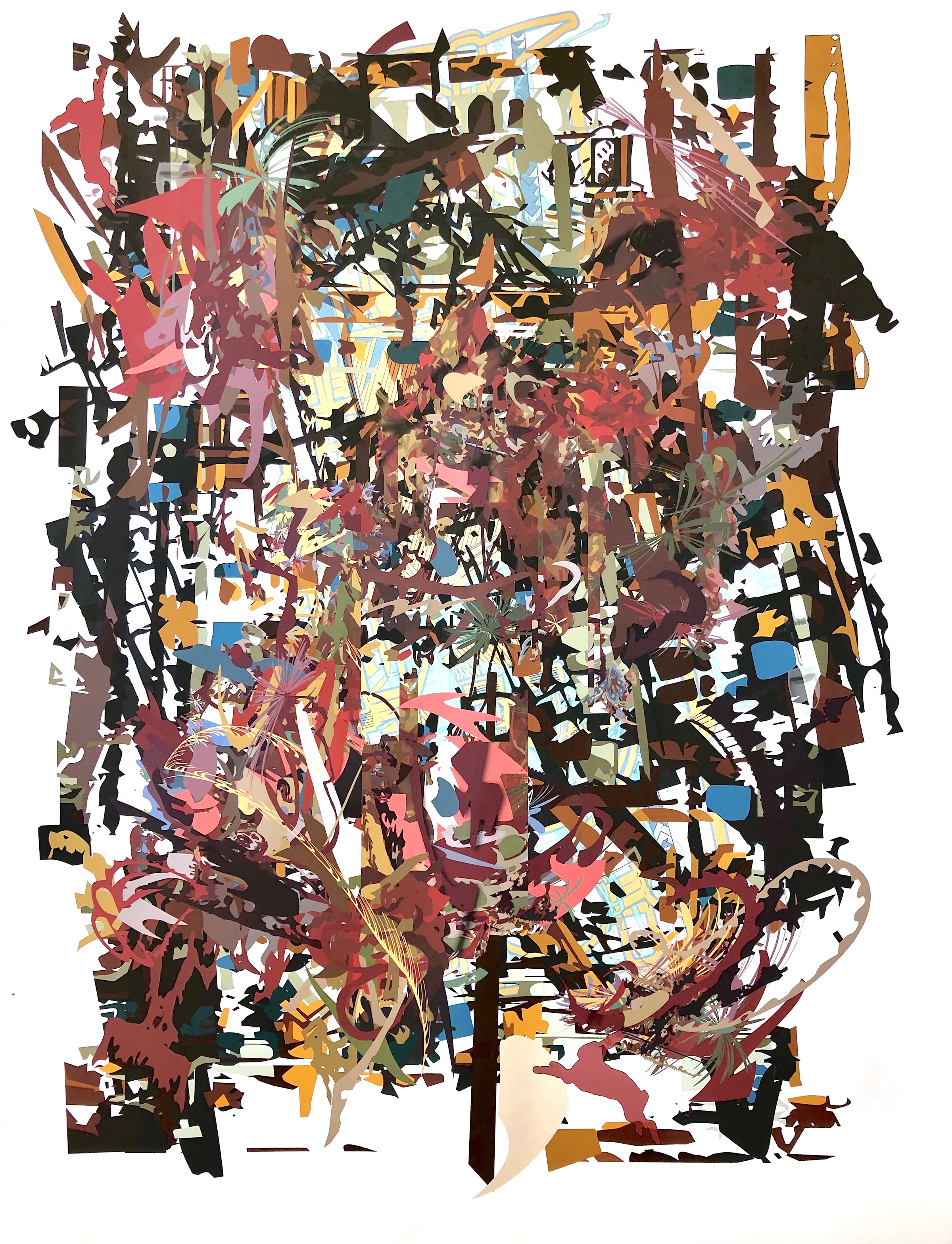 Praximul and the other compositions in the Praxis series of prints expand on the metaphor of regenerating the self. The ideas of order and chaos can be compared to ideas of control, accuracy, anxiety and uncertainty. All of these concepts are at play in this print. Non-representational shapes coincide with representational shapes and symbols that denote chaos and order respectively. The compositions continue the use of layers of warm red hues that serve to represent anxiety and uncertainty overlapping cooler blues and greens. The slight hint of pattern emerges from the composition in a gesture of attempted unification – trying to bring all of the formal elements and concepts together. Each of the prints in the Praxis series capture the moment when line, color and shape are merging and struggling to become one. These images offer an impression of chaos and control existing simultaneously, and through continuous conflict reflect the internal struggle of the artist.