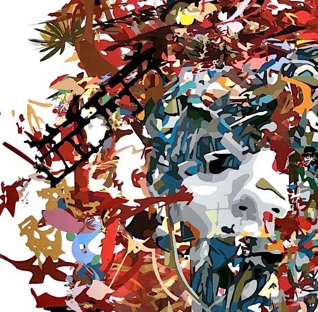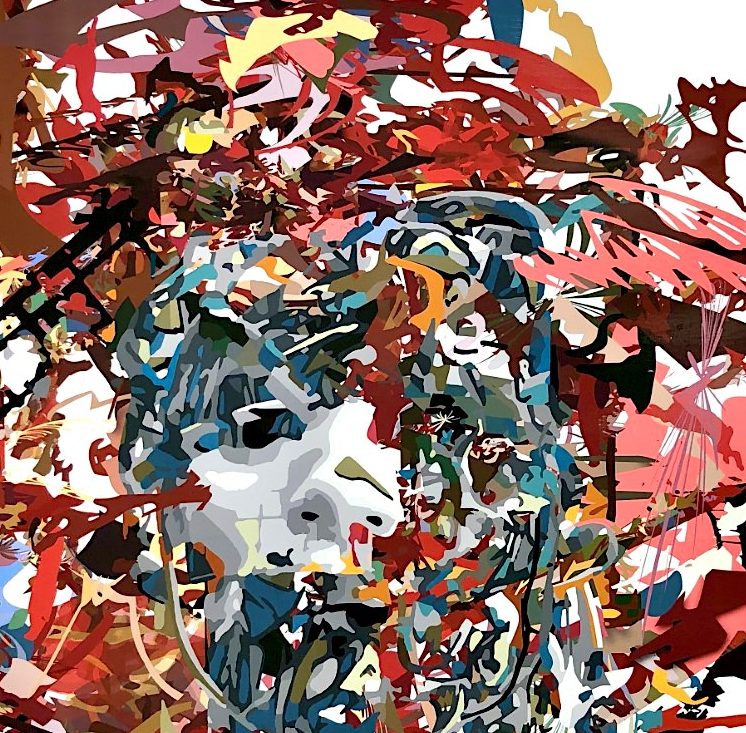 To create this print I used the image of the face and neck from the Thinking and Dreaming print. The face is more distorted and obscure, but it’s still there, hidden behind layers of non-representational shapes. There is a sense of kinetic activity as jagged shapes provide a sense of movement throughout the composition. The right side of the face looks as if it’s being filled or taken over by curvilinear lines and bright colors. And yet there is no expression on the face itself. This can be viewed as the concepts of anxiety and uncertainty combined with accuracy and control flowing in, around and through the central figure.