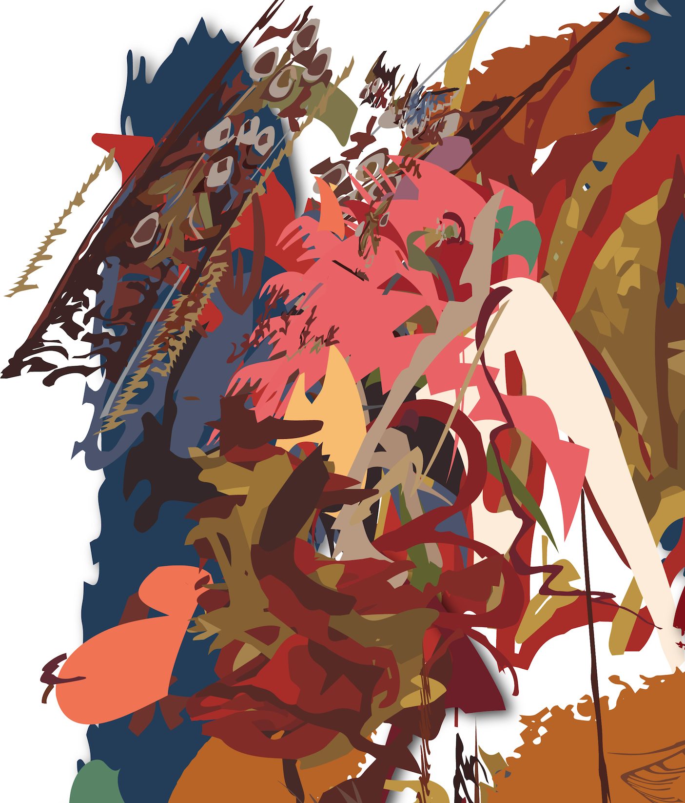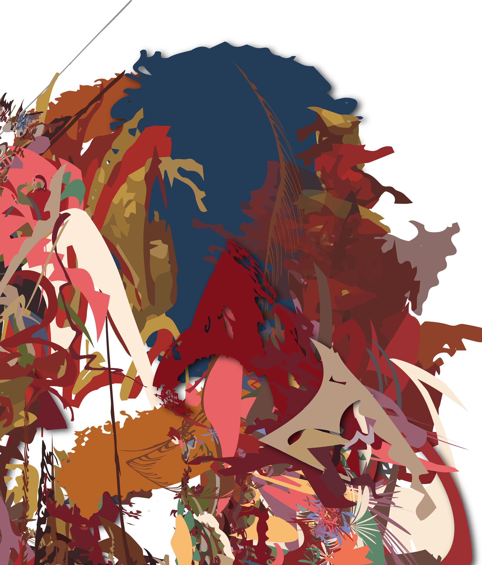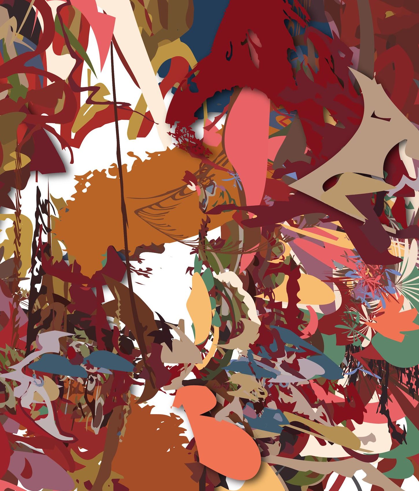 Craxis is the fourth print in the Laetus series and like the others is a single, non-editioned print. Similar shapes, lines and color palette are evident in this print and link it to the rest of the series. The large blue shape in the top right portion of the print stands out, offering the viewer a respite from the complex design elsewhere. The surge of color and shape swirl together in a wild combination, seeming to advance and recede from the picture plane simultaneously.